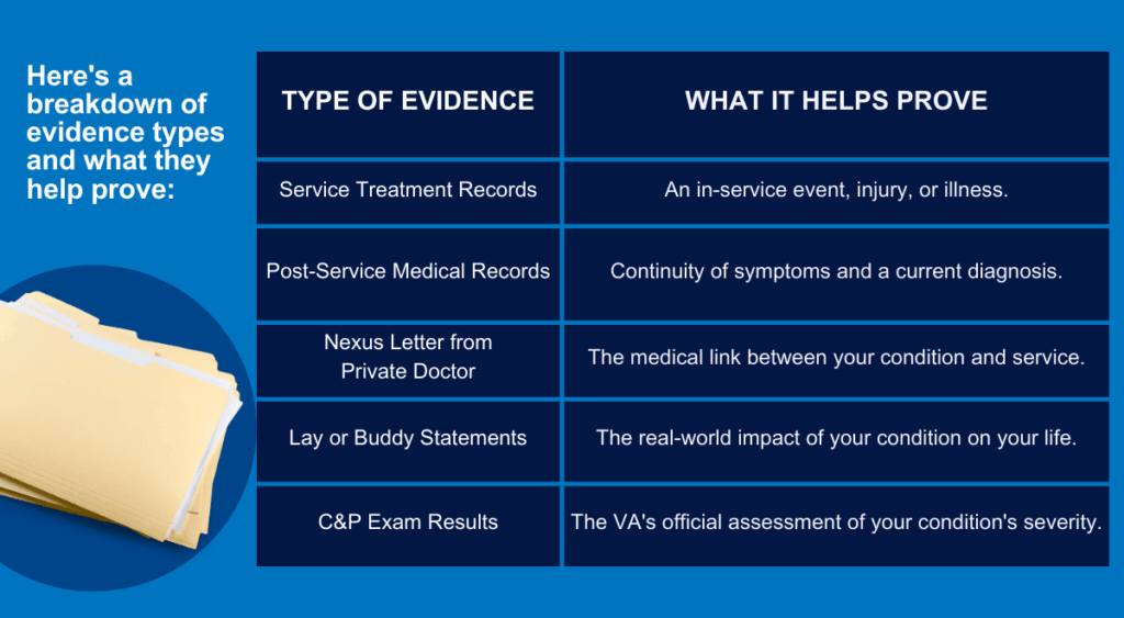 Each document adds a piece to the puzzle of your health history. When combined, they can create a compelling argument for service connection that the VA is more likely to approve. We’ll review each of these evidence types in more detail.