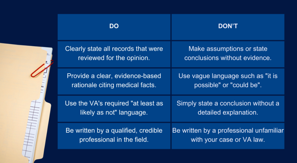 An opinion that hits all these points is much harder for the VA to dismiss. It presents a complete and persuasive argument that speaks their language. Ultimately, it helps the rater at the VA regional office do their job, which is to approve valid VA disability claims.