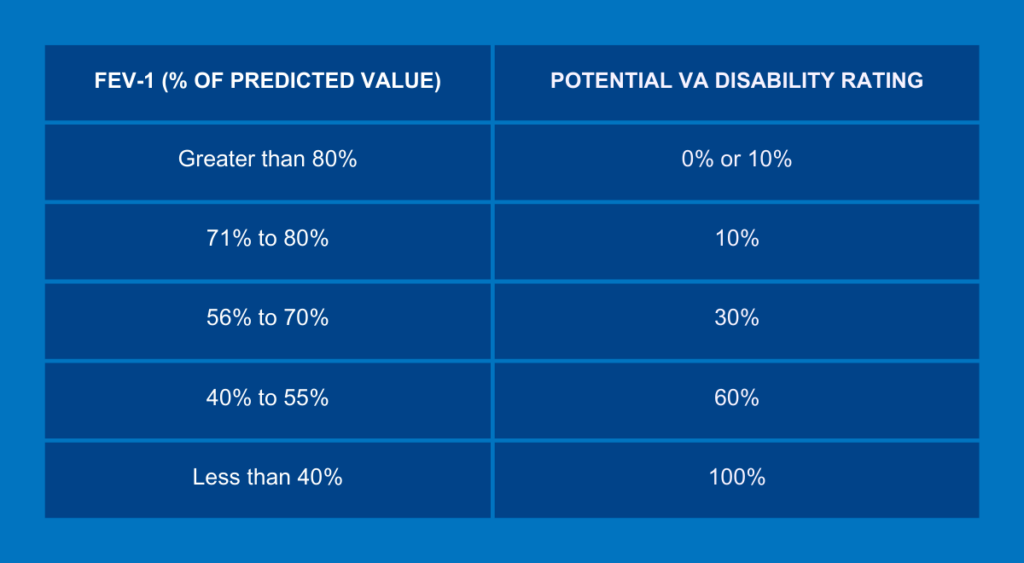 According to the VA’s rating schedule, these numbers can directly translate to your disability rating. You should always submit current evidence from your function tests. It’s important to submit additional evidence if your condition worsens over time.