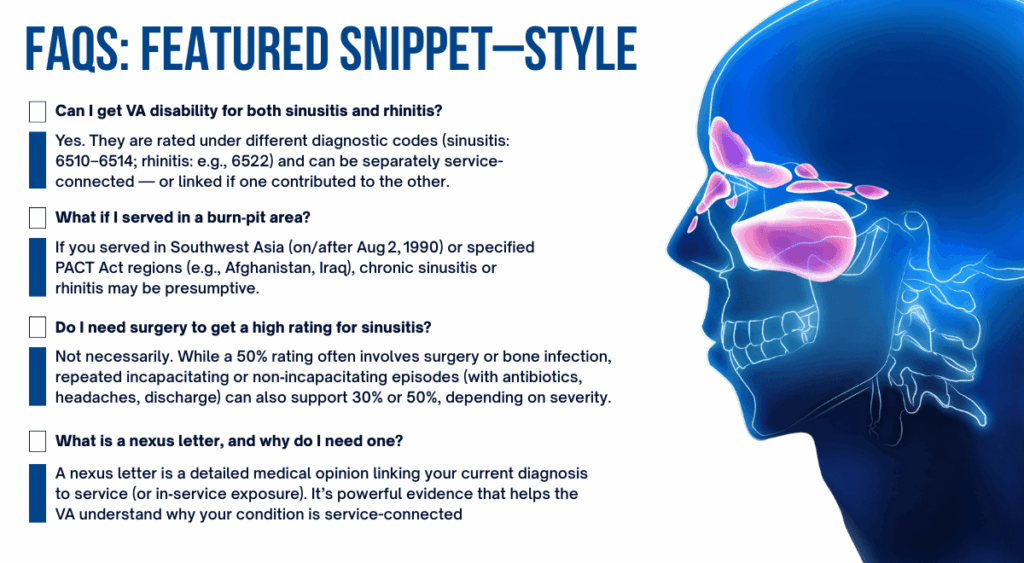 - Some veterans don’t realize that rhinosinusitis (a combined nasal & sinus diagnosis) can fall under newer rules, especially for exposure-based claims.