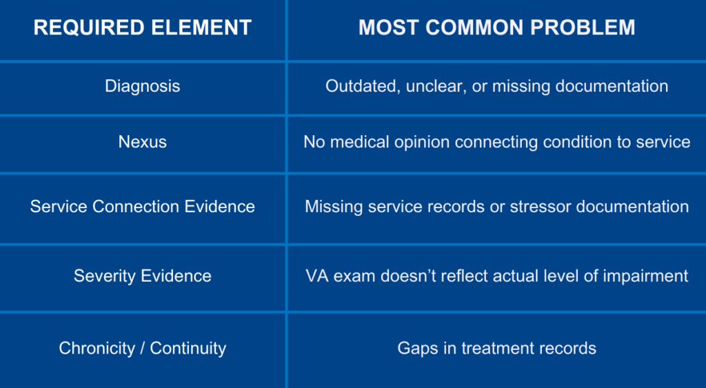 Most VA denials happen because ONE of the required pillars is missing: